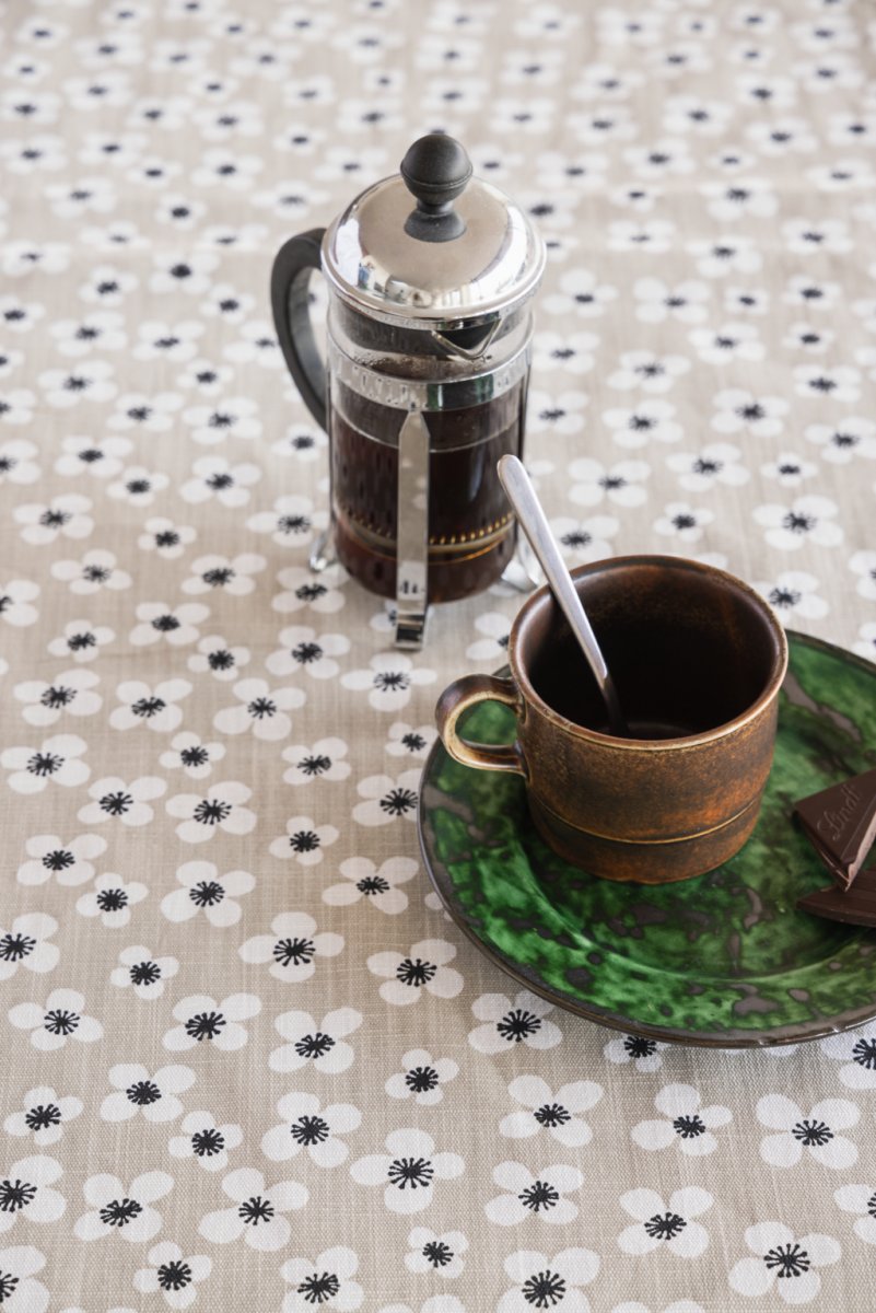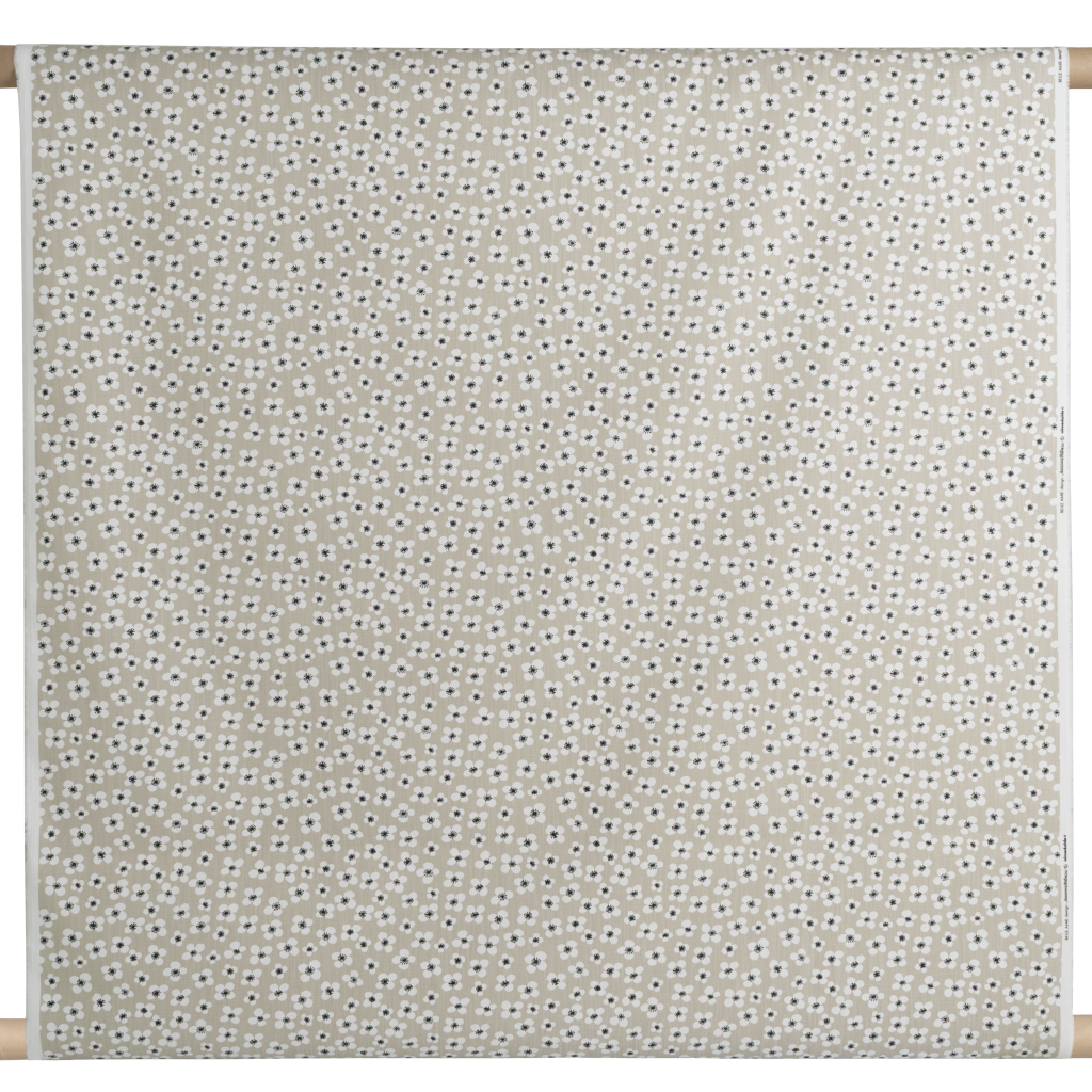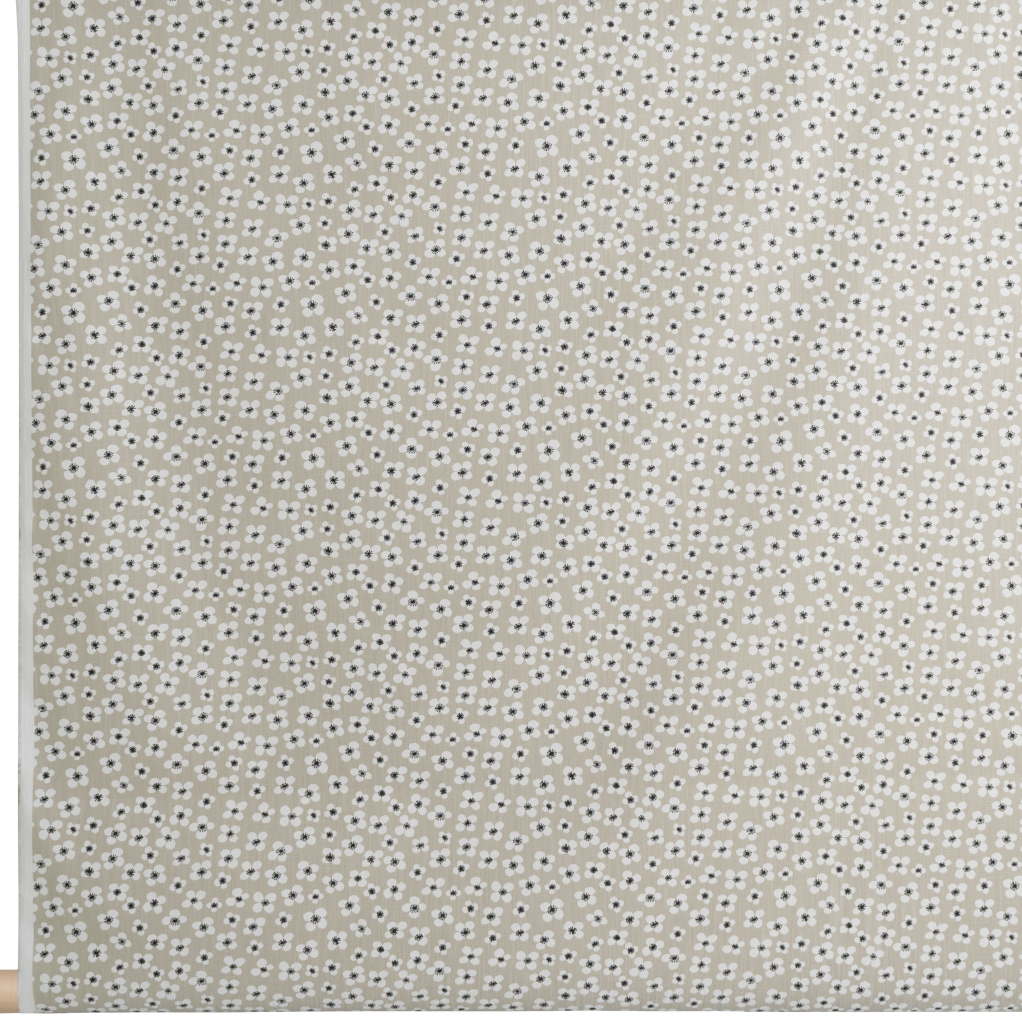 Belle Amie metervara beige har ett klassiskt blommönster formgivet av Marianne Westman, en av Sveriges mest kända formgivare under 1950- och 60-talet. Hon är särskilt förknippad med brukskonst och mönster som kombinerar funktion med ett varmt, tidstypiskt formspråk. Belle Amie, med sina stiliserade blommor, är ett av hennes mest välkända textilmönster och återfinns i Körsbärsträdgården från 1959.