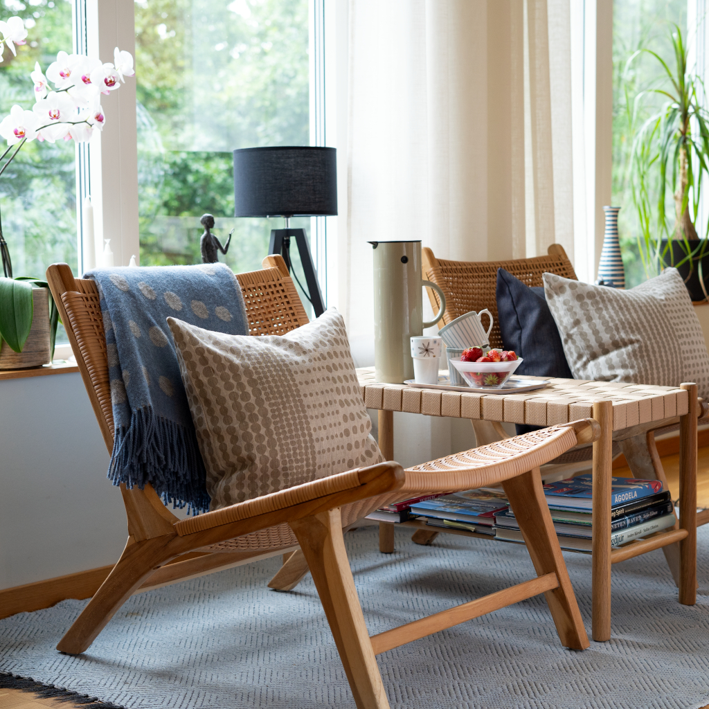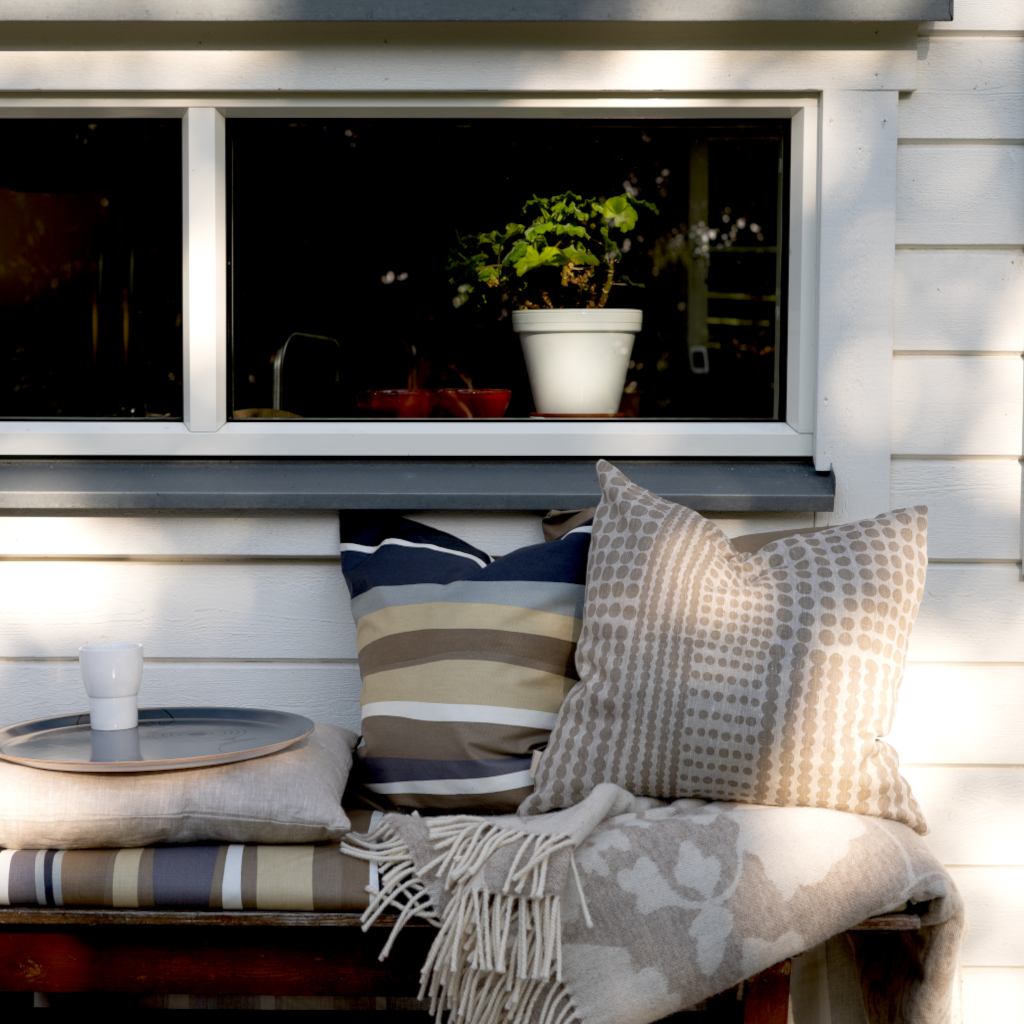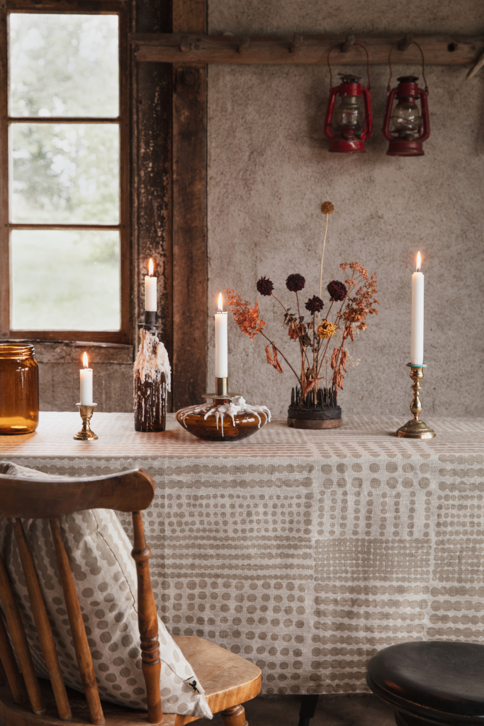 Pricktyg kännetecknas av en grafisk enkelhet där varje prick är handmålad och placerad med omsorg. Pricktyg natur/taupe har en mjuk beige ton tryckt på oblekt linnetyg som har en härlig levande yta.