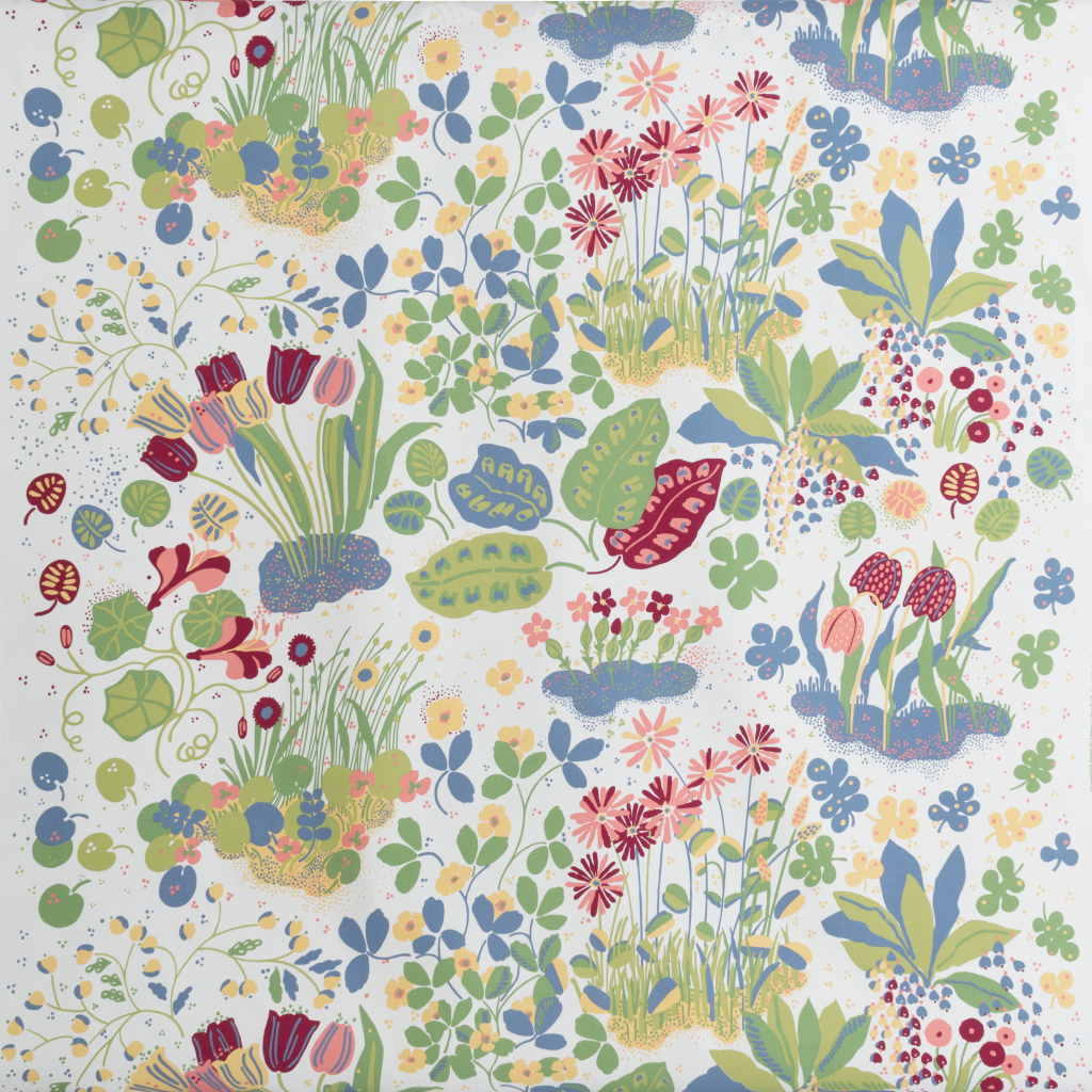 Mönstret, skapat av Louise Carling på 1970-talet, visar slingrande blad och växtformer i ljusa, somriga toner som ger bordet en levande och harmonisk känsla.