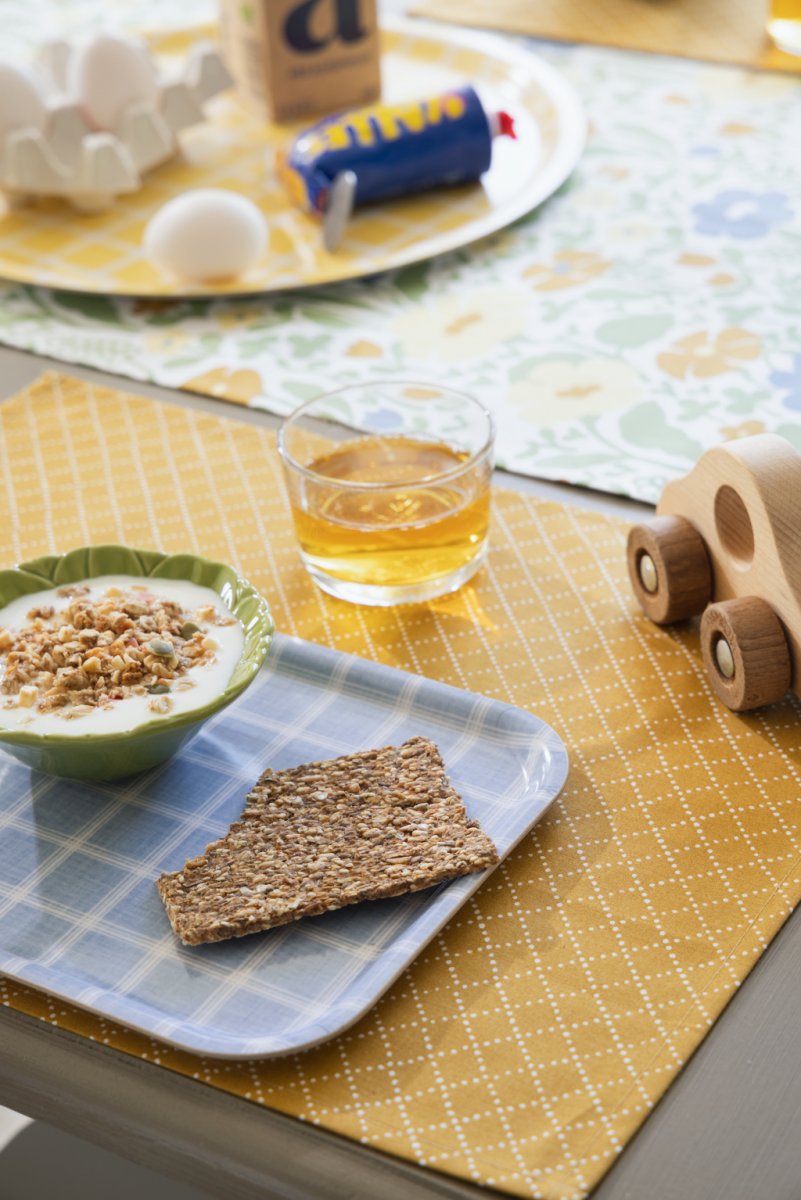Brickan Kristina – med en klassisk ruta i tidlösa färger. De handritade och något ojämna linjerna gör den långt mer intressant än om den hade varit perfekt framställd digitalt. Skönheten ligger i det operfekta, vilket låter oss ana närvaron av den mänskliga handen. Mönstret "Kristina" är en originaltryck från vårt arkiv och fångar känslan av hantverk och äkthet.