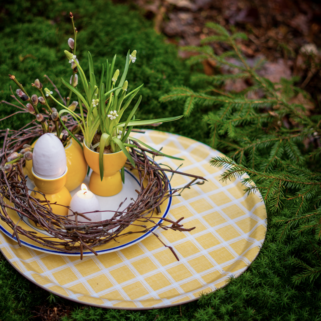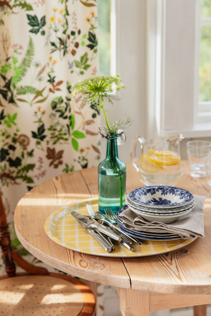 Brickan Kristina – med en klassisk ruta i tidlösa färger. De handritade och något ojämna linjerna gör den långt mer intressant än om den hade varit perfekt framställd digitalt. Skönheten ligger i det operfekta, vilket låter oss ana närvaron av den mänskliga handen. Mönstret "Kristina" är en originaltryck från vårt arkiv och fångar känslan av hantverk och äkthet.