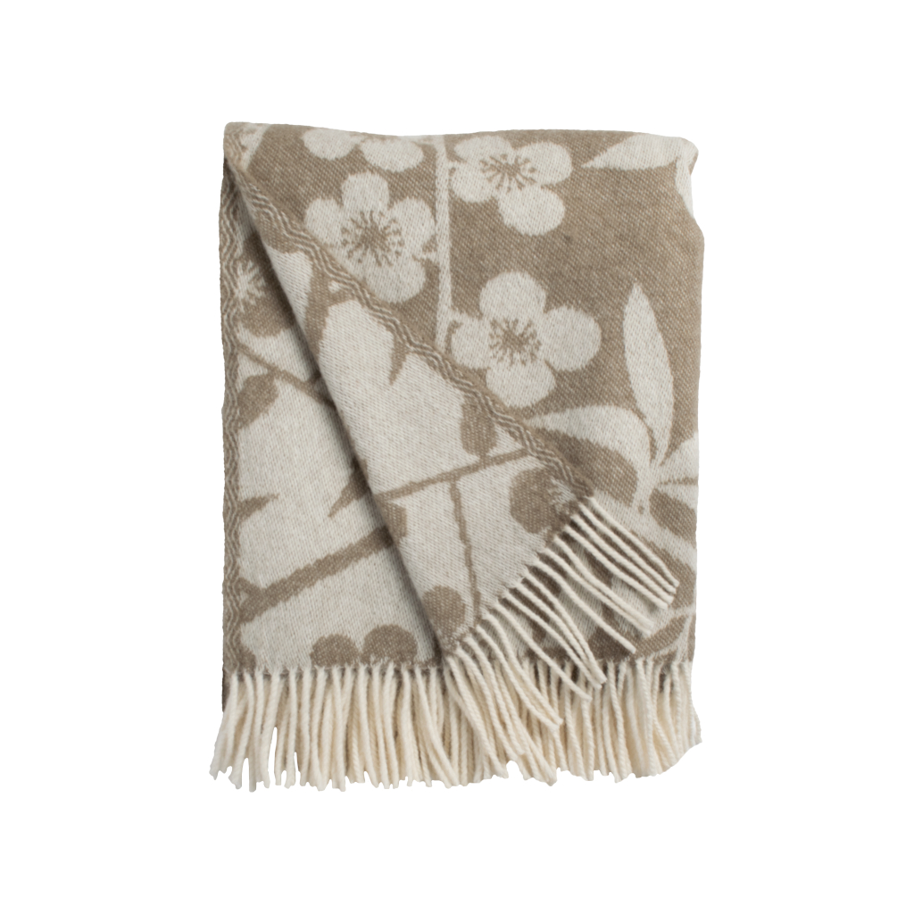 Den vävda ullpläden med mönstret Körsbärsträdgården i storskalig tolkning är både dekorativ och värmande. Färgkombinationen av brunt och off white skapar ett sobert uttryck – och eftersom pläden är vändbar får du två uttryck i en. Passar fint på soffan, läsfåtöljen eller fotänden av sängen.