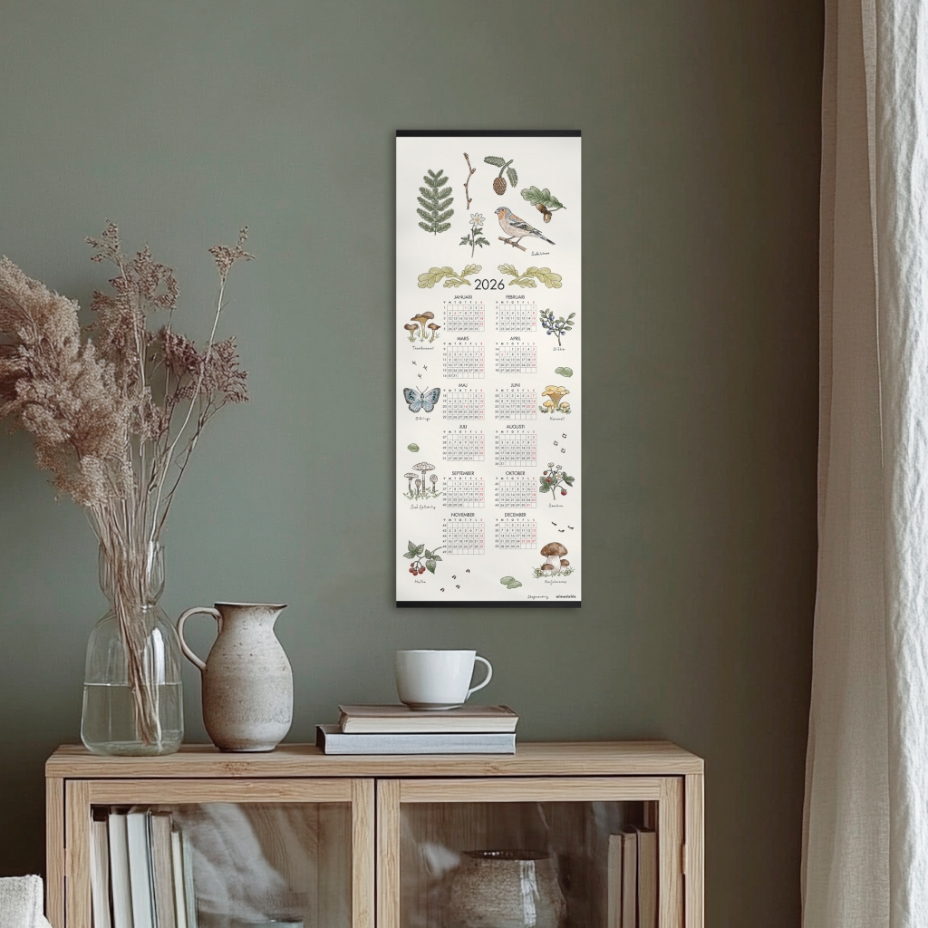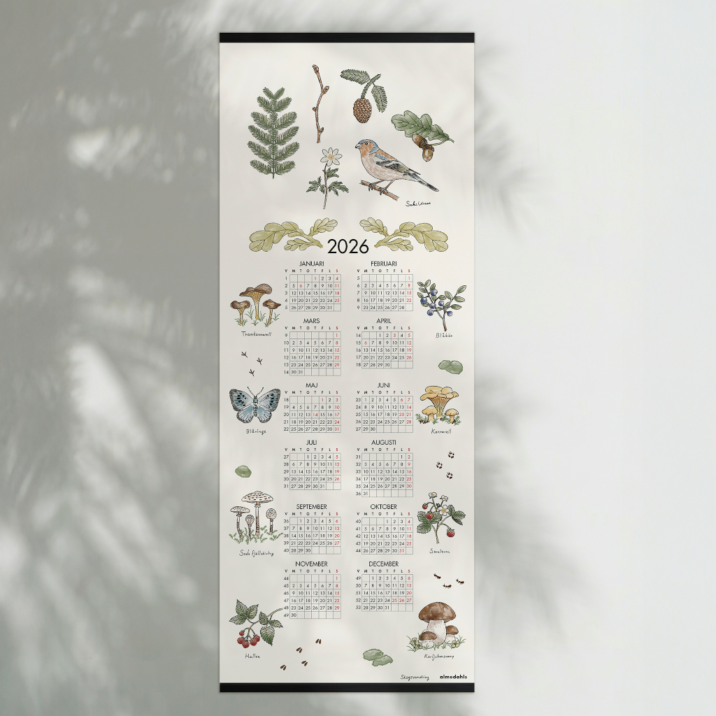 Skogsvandring kalender 2026 - väggkalender med handritade motiv från den svenska skogen. Kalendern är designad 2026 av vår egen designer Saki Urata.