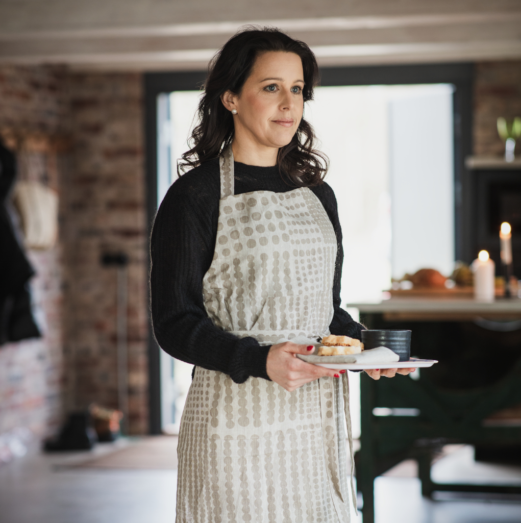 Pricktyg kännetecknas av en grafisk enkelhet där varje prick är handmålad och placerad med omsorg. Pricktyg natur/taupe har en mjuk beige ton tryckt på oblekt linnetyg som har en härlig levande yta.