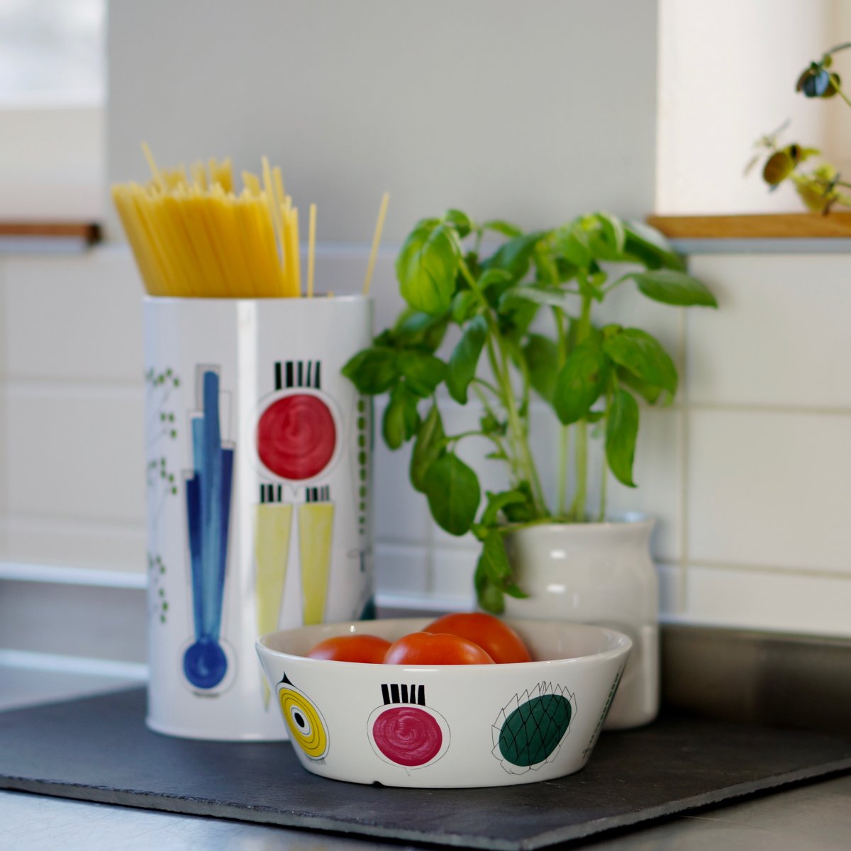 Picknick, rund burk, multi, 110x190 mm. Perfekt för förvaring av tex småsaker, gryn eller skorpor, eller som dekoration med tex pasta, grissini eller slevar.